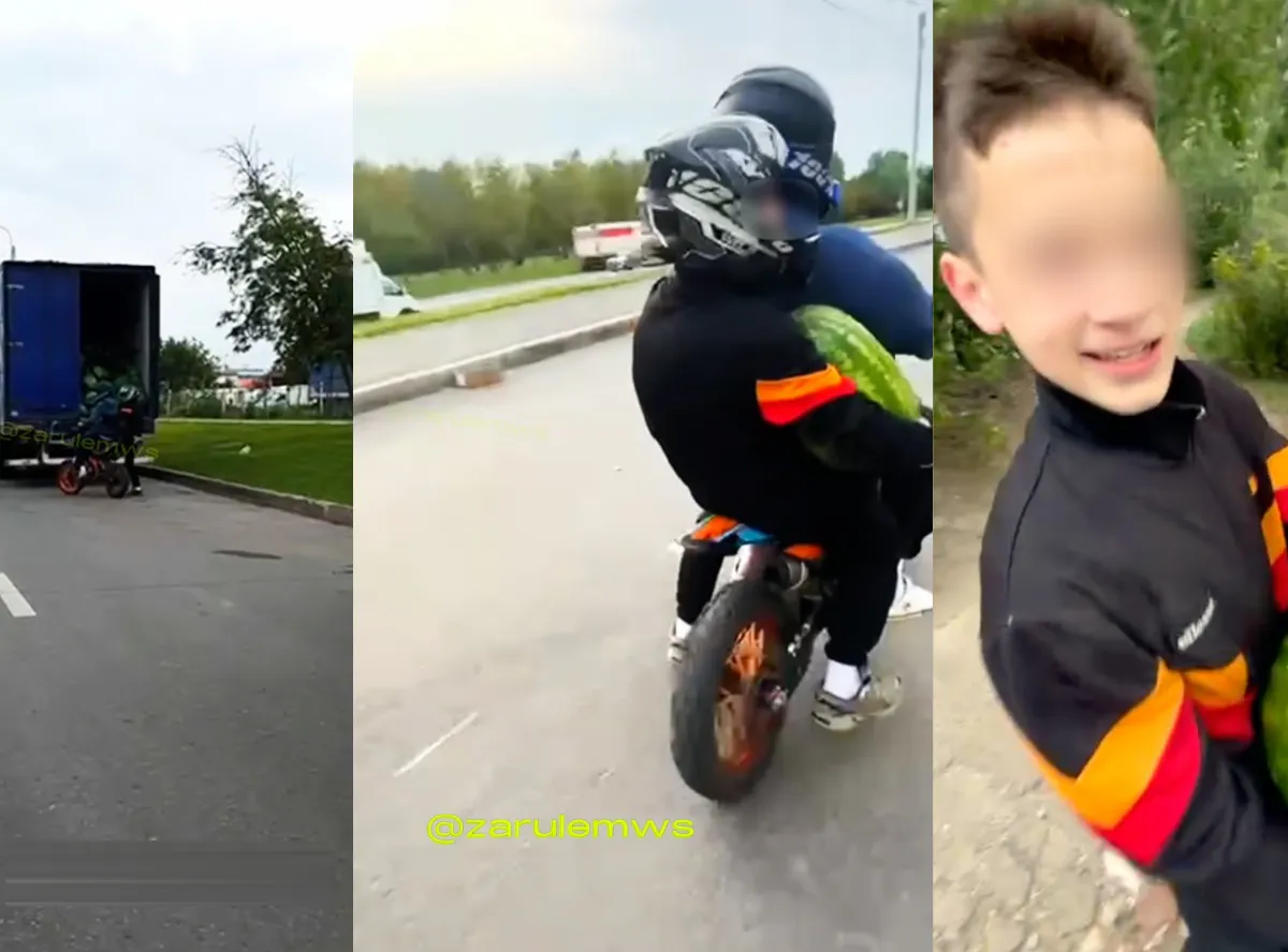 Согласно записи, несколько несовершеннолетних на двух питбайках пересекли две сплошные линии, подъехали к большегрузу и вытащили арбуз из его открытого кузова.