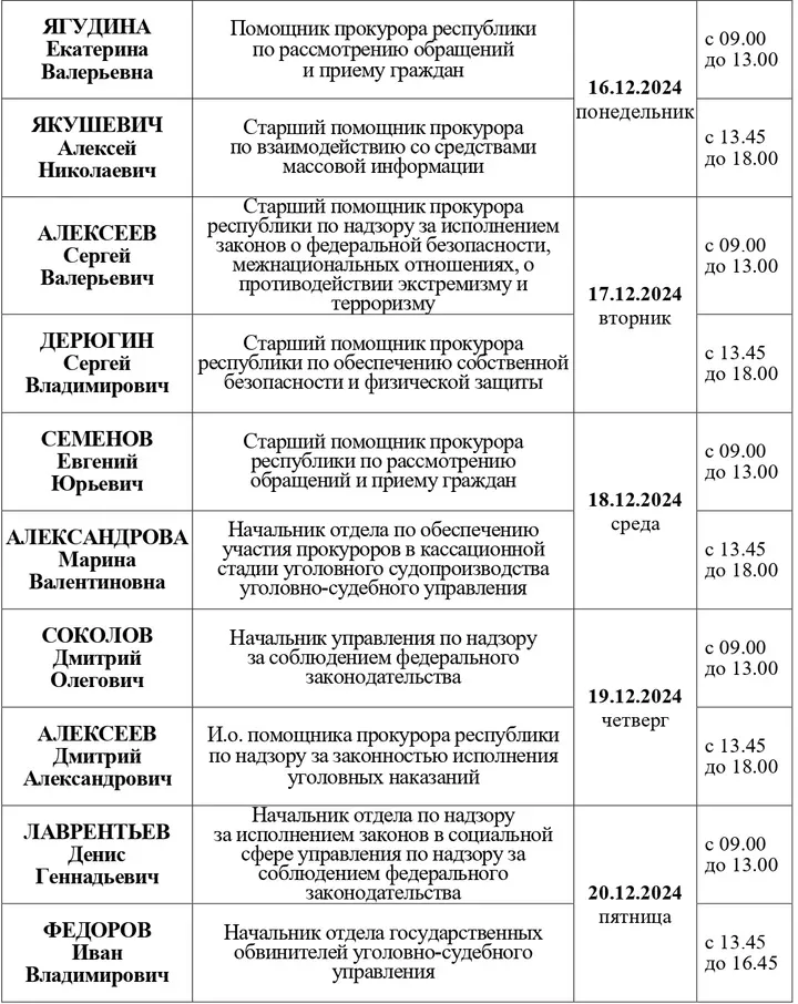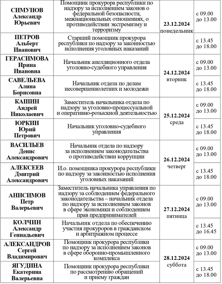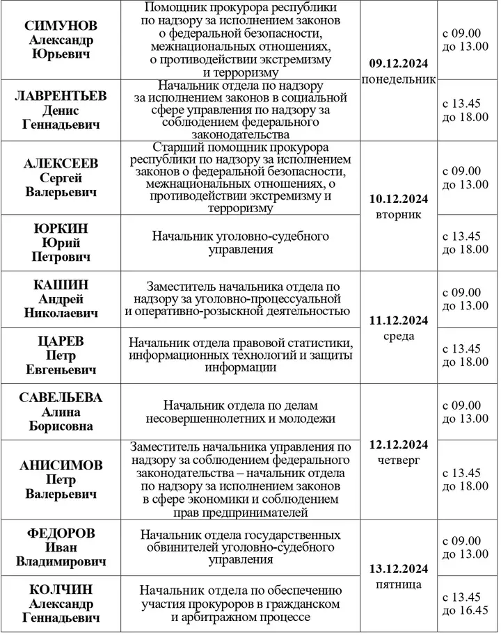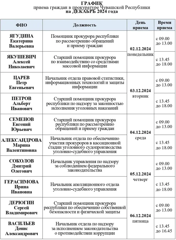 Прокуратура Чувашской Республики опубликовала график приема граждан руководителями подразделений на декабрь 2024 года.