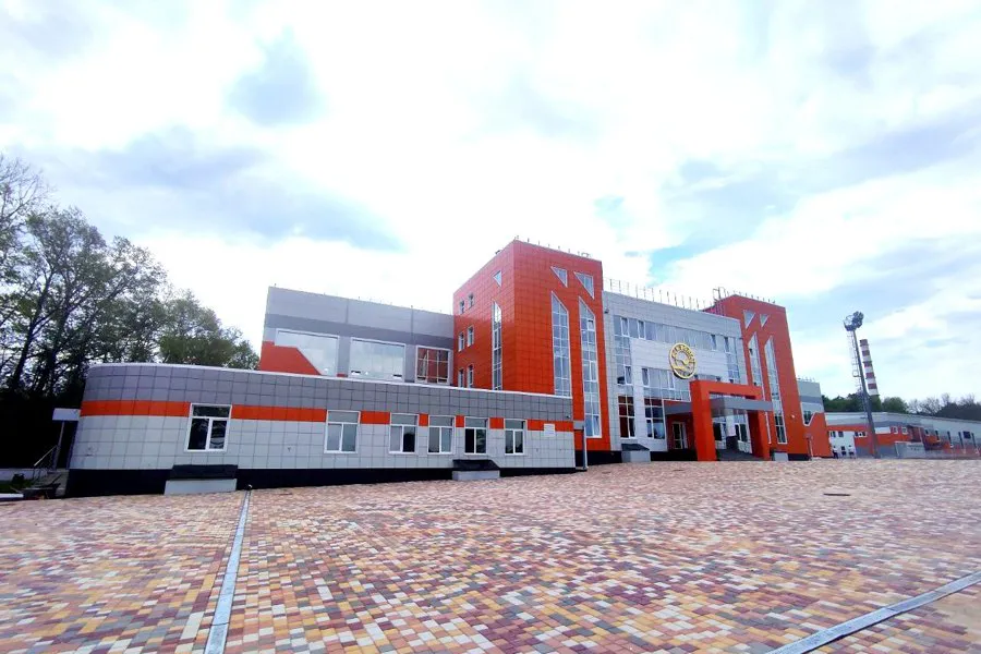 - Футбольный стадион: поле с искусственным покрытием, легкоатлетические беговые дорожки, мачты освещения, трибуны для зрителей.