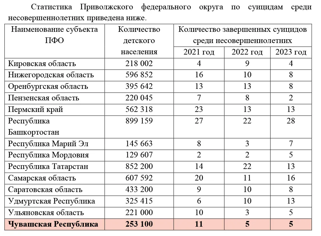 В последнее время в Чувашии наблюдается значительное увеличение случаев суицида среди молодежи. В докладе Алевтины Федоровой, уполномоченного по правам ребенка в Чувашии за 2023 год, подчеркнута эта тревожная тенденция. Документ, представленный депутатам на сессии Государственного Совета в конце прошлой недели, освещает эту проблему. Об этом сообщает "Правда ПФО".