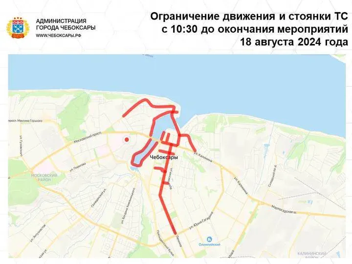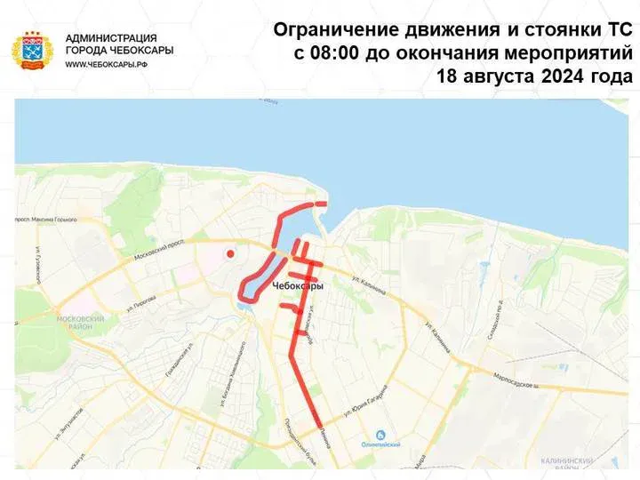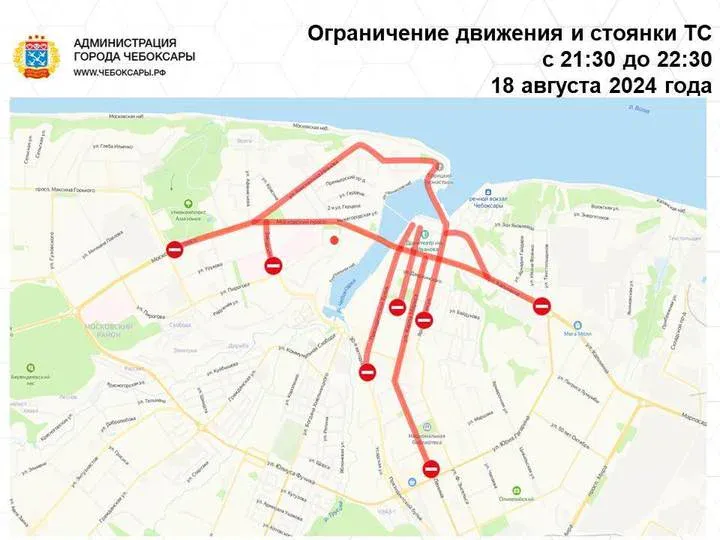 С 7 утра 16 августа до завершения всех торжеств 18 августа будет введено ограничение движения и парковки транспорта практически по всему периметру Чебоксарского залива, на улице Ленинградской и по Президентскому бульвару (от пересечения с улицей Композиторов Воробьевых).