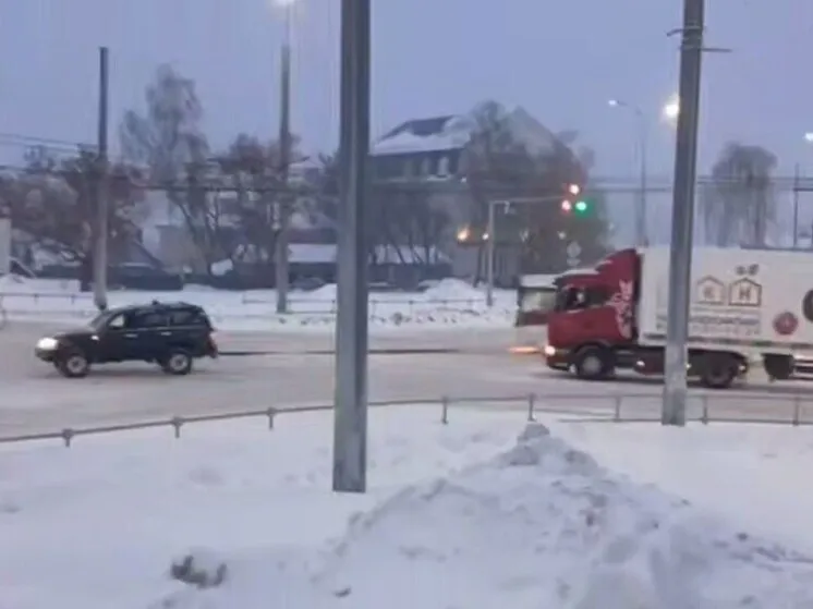 Водитель внедорожника помог буксировать застрявшую фуру на заснеженном перекрестке в Чебоксарах